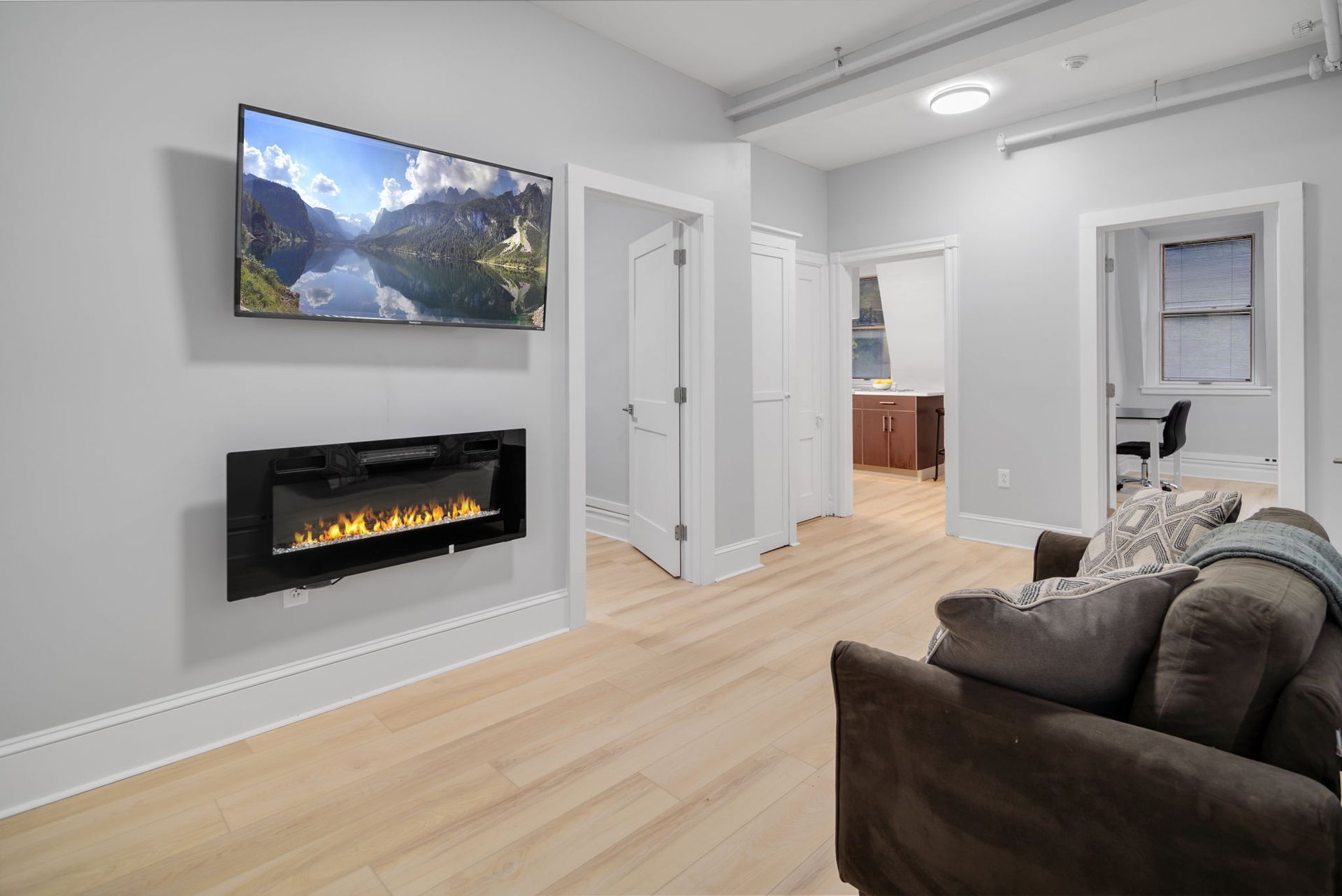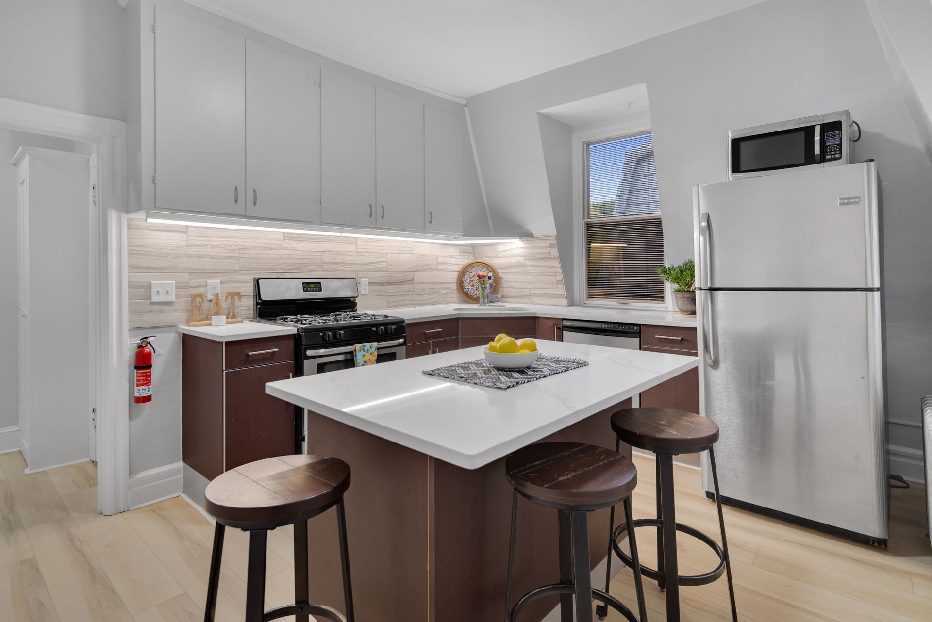 Each apartment comes fully furnished and features all new kitchens, upgraded bathrooms, new flooring and remodeled living and bedroom areas. Enjoy this home's classic charm blended with modern amenities like custom tile baths, LED vanity mirrors, smart lights and digital door access. The kitchens feature a full suite of new stainless steel appliances, wood cabinets, and quartz countertops. Common areas feature new furnishings including wall-mounted flat screen TVs and space for living and dining accordingly. Additional Furnishings include a couch, dining room table and chairs or kitchen counter seating, full size bed frame and mattress, desks and desk chair, and closet and dressers or large armoire in each bedroom.