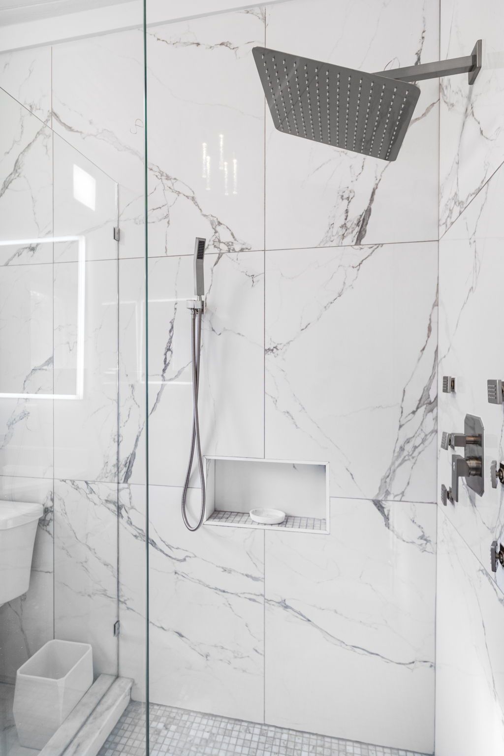 The bathroom features floor-to-ceiling marbled porcelain tiles, a custom-built shower with a glass enclosure, waterfall showerhead, body sprayers, and wand settings. A corner vanity with dual LED mirrors adds a touch of elegance.