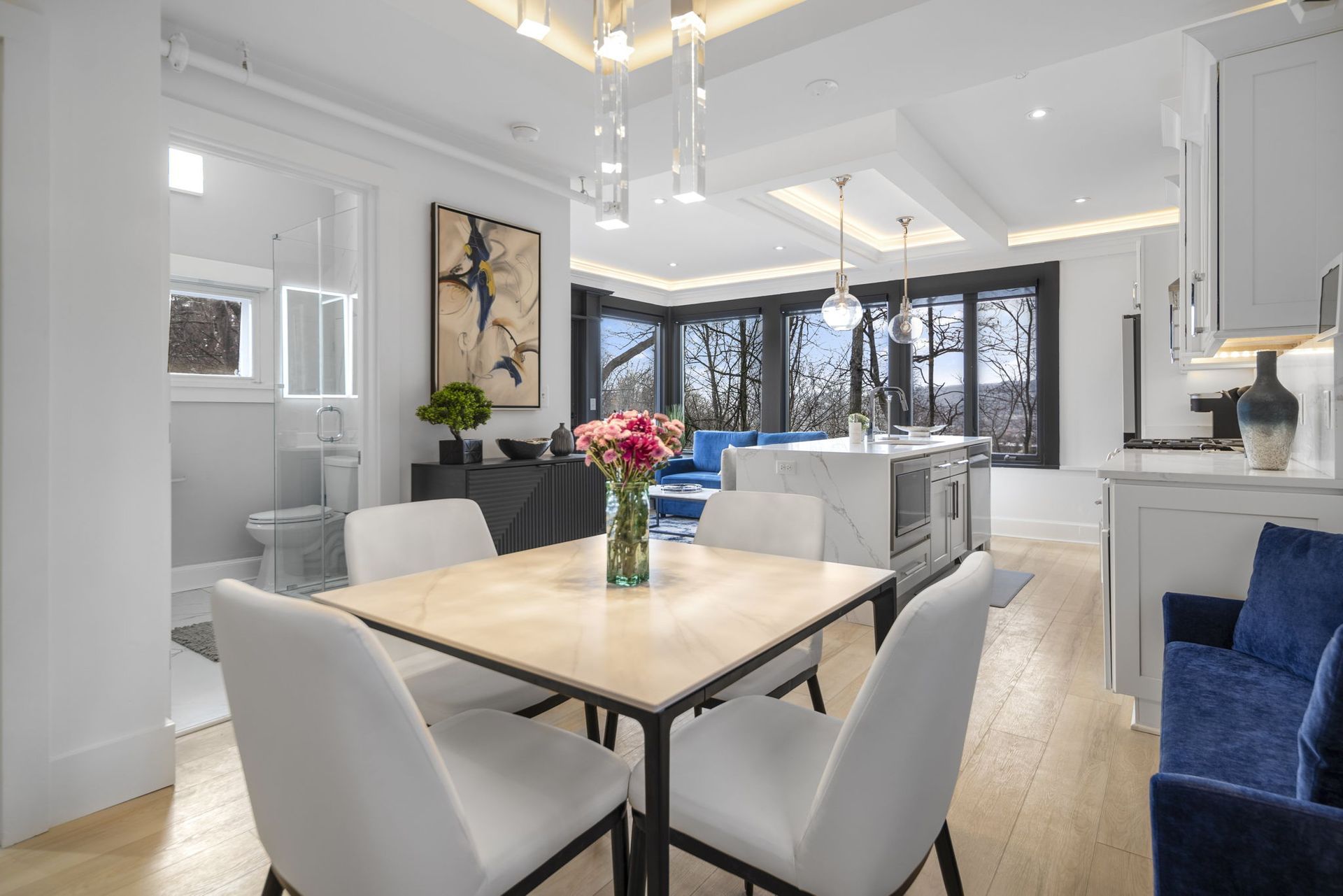 This modern kitchen boasts all stainless steel appliances, including a 4-panel French door fridge/freezer, gas range, and oven. The stunning waterfall-edge island offers seating for four and is complemented by a large kitchen sink, dishwasher, and under-counter built-in microwave.