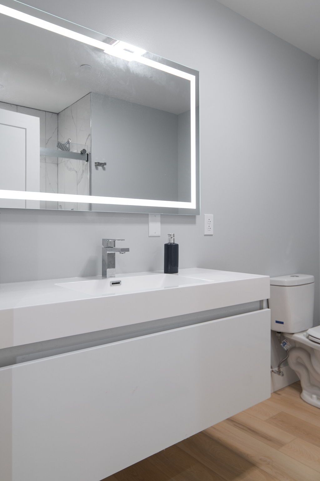 The bathroom features custom tile porcelain bathtub surrounds with glass enclosure, a shower system with shower head, body sprayers, and wand settings. Well appointed bathroom vanity with LED backlight mirror that adds a touch of elegance.
