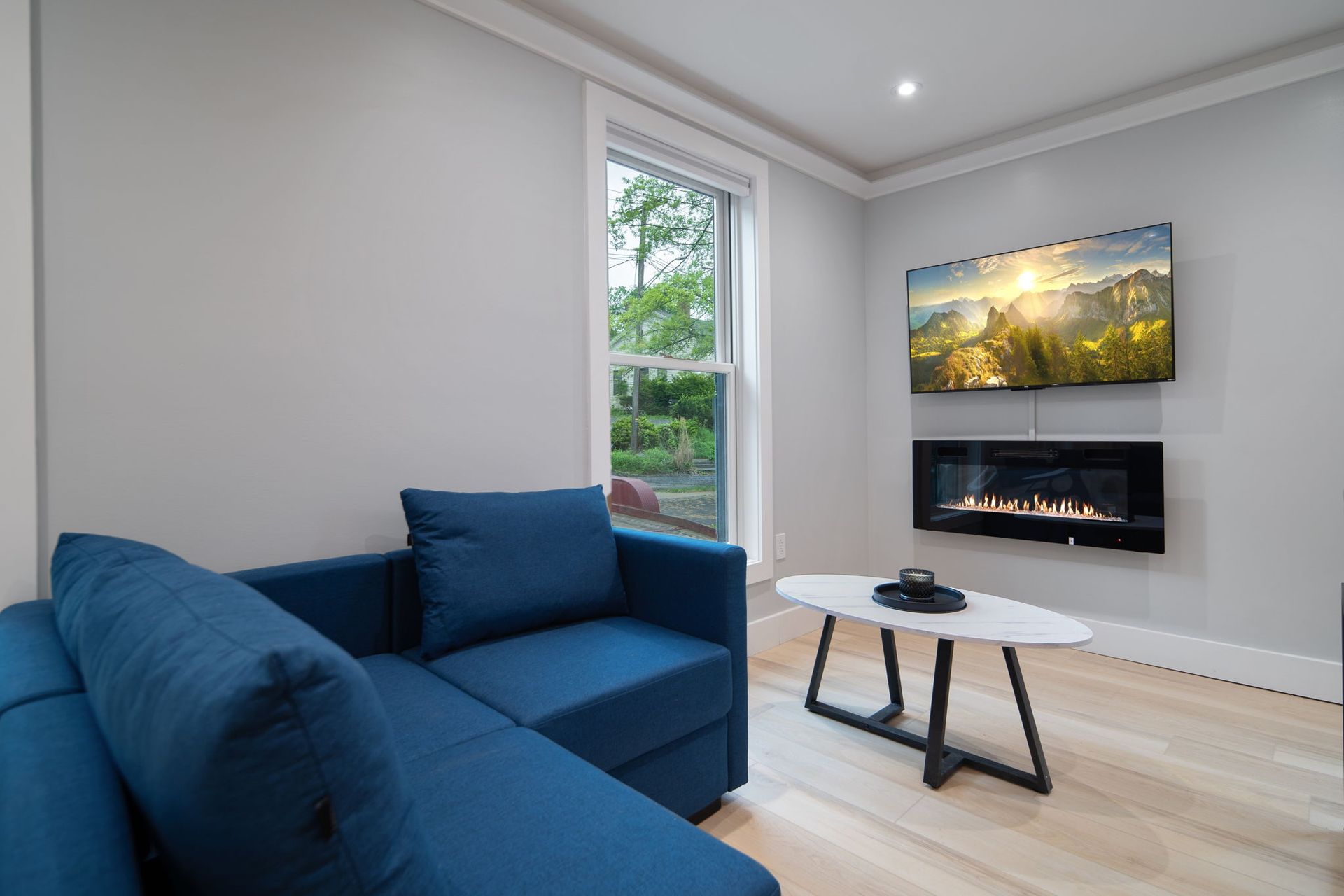 The living room is designed for comfort and style, featuring a plush modern sofa, LED fireplace, and Smart TV—ideal for both relaxation and entertainment.
