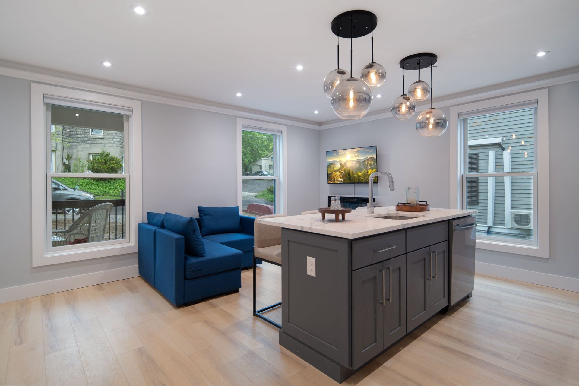 The spacious open floor plan effortlessly connects the kitchen, living, and dining areas. All new large energy efficient windows bathe the space in natural light.