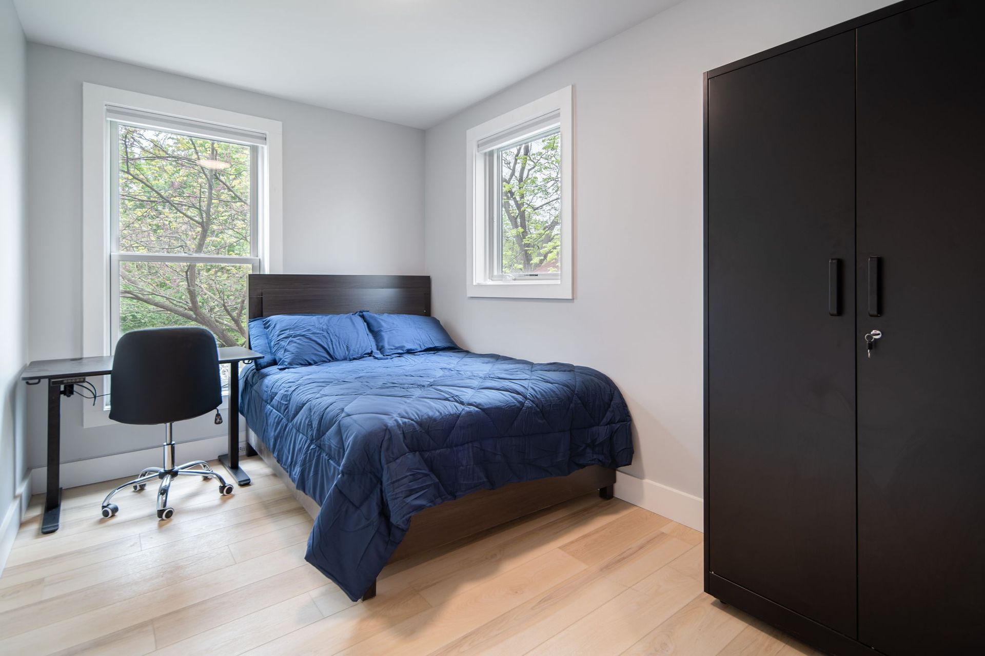 All bedrooms are furnished with premium memory foam mattresses on full-size bed frames. Each comes with an Armoire or Closet, desk and task chair.