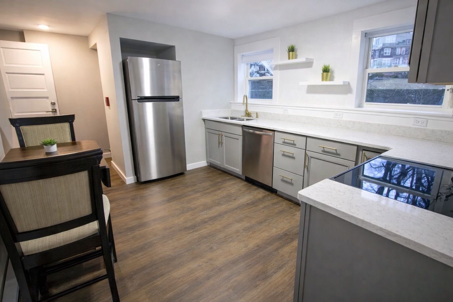 Ce spacieux appartement d'une chambre dispose d'une grande cuisine dînatoire. Entièrement rénové, il comprend de nouvelles cloisons sèches, un revêtement de sol en vinyle de luxe, ainsi que des appareils électroménagers et des luminaires modernes. La nouvelle cuisine est dotée d'un magnifique plan de travail en quartz marbré, d'appareils électroménagers contemporains en acier inoxydable et d'une robinetterie en nickel brossé. La salle de bain est équipée d'une douche carrelée, d'un nouveau meuble-lavabo et d'un miroir tactile à LED.