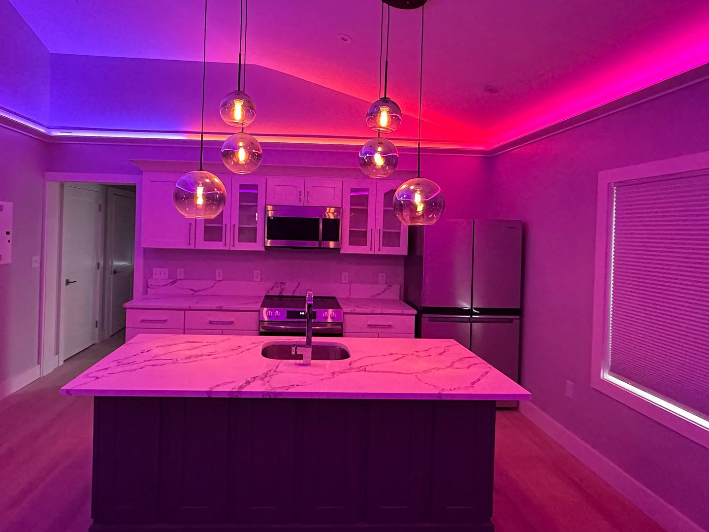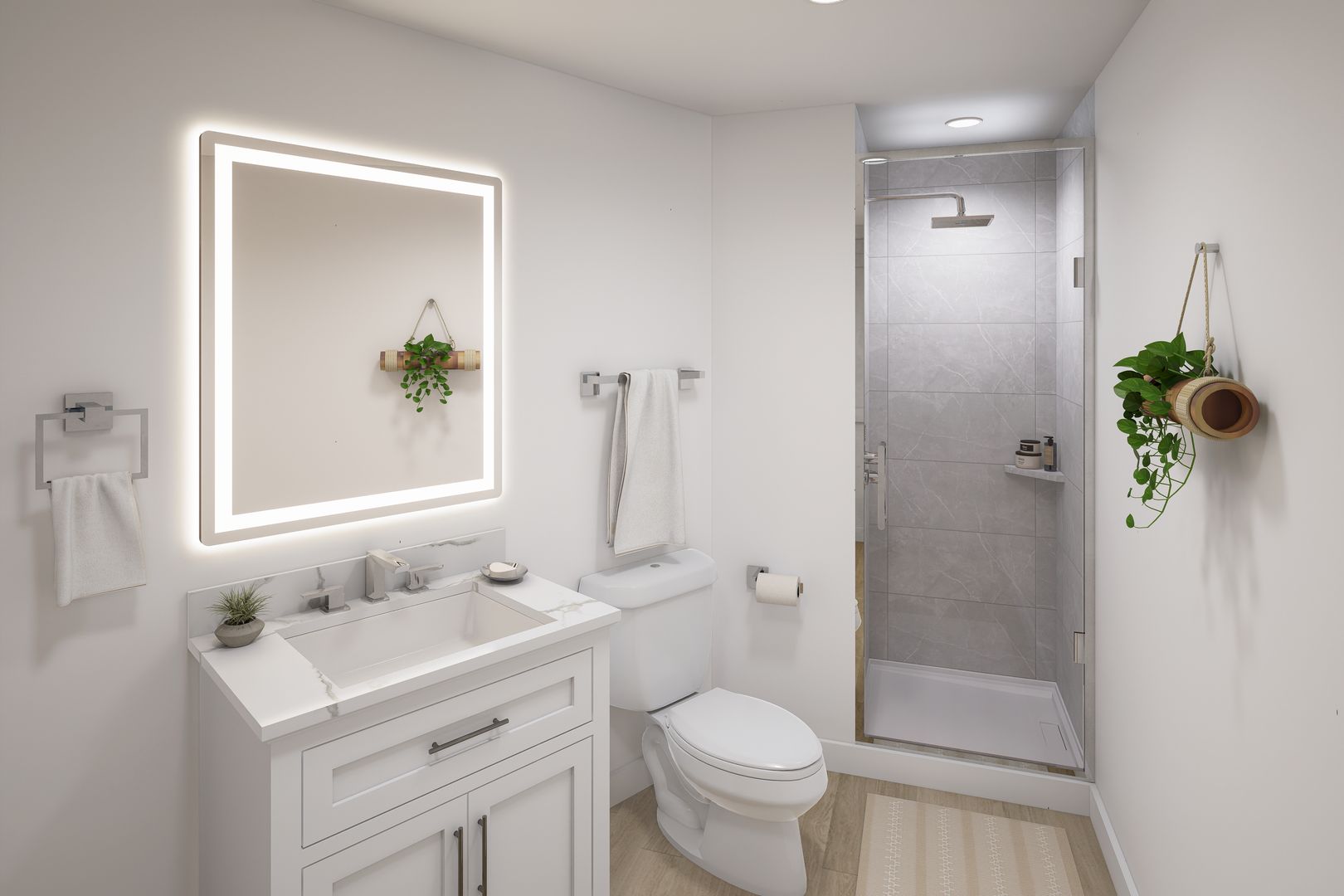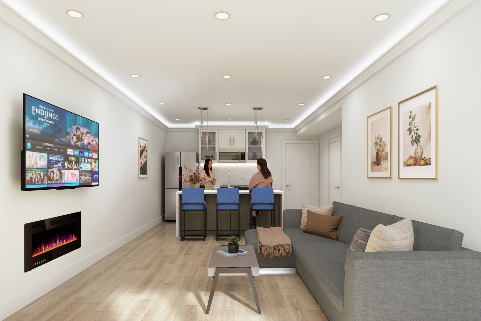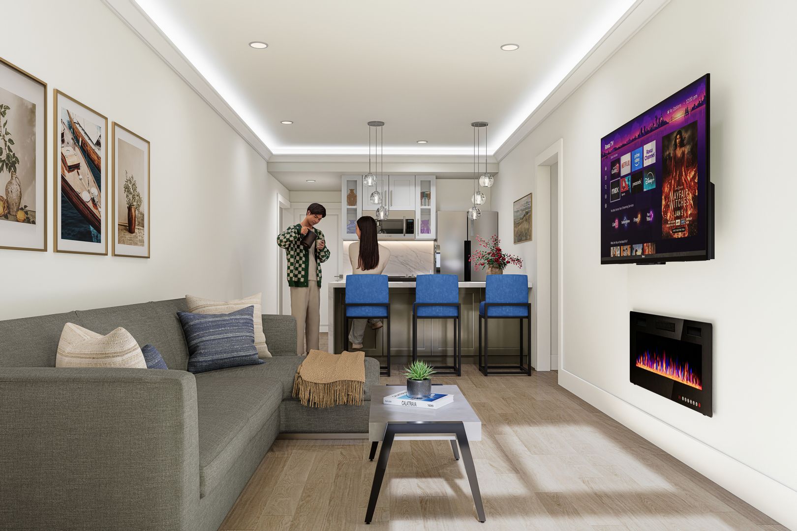 Inside, the details keep everything feeling clean and updated. The living space includes an ambient LED fireplace and mounted smart TV, and the kitchen is finished with stainless steel appliances and quartz countertops that are both modern and practical. The bathrooms follow that same style, with glass showers, LED mirrors, and simple, well-designed finishes. Select units also include Juliet balconies with views of Cascadilla Gorge and Collegetown.