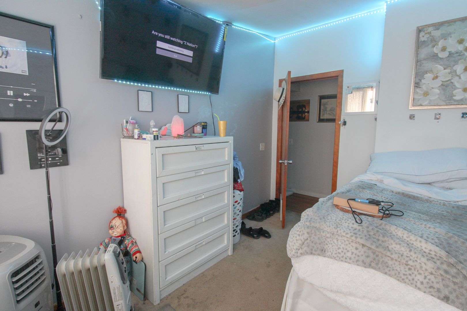 Furnishings include couches, full-size or larger bed frame, box spring and mattress, desk, desk chair, dresser, and window treatments.