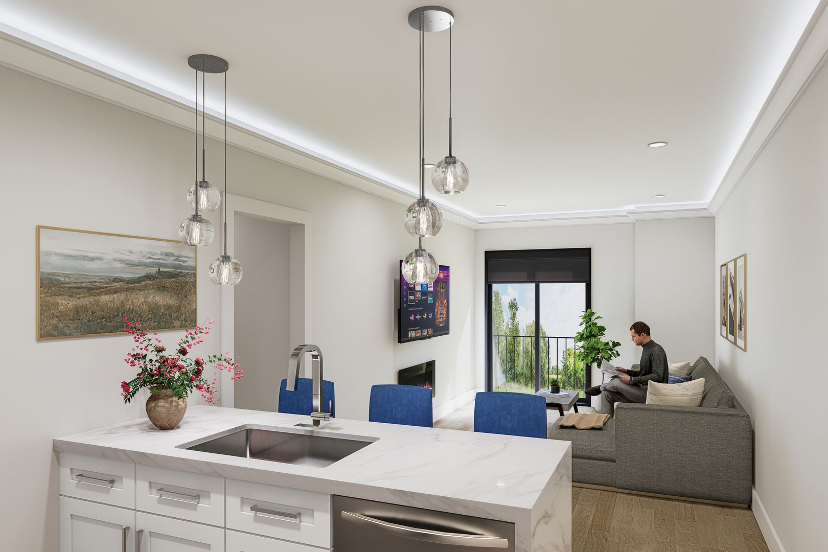 Inside, you’ll find details that make a difference day to day. The living area features an ambient LED fireplace and mounted smart TV, while the kitchen is finished with stainless steel appliances and quartz countertops, giving it a clean, modern look. The bathrooms carry that same style, with glass showers, LED mirrors, and updated finishes. Select units also include Juliet balconies with views of Cascadilla Gorge and Collegetown.