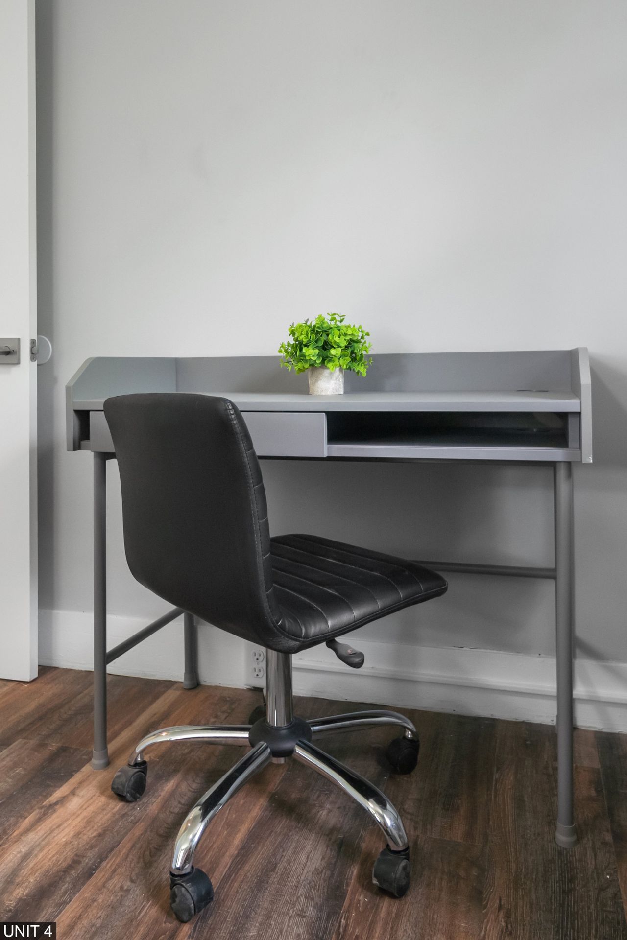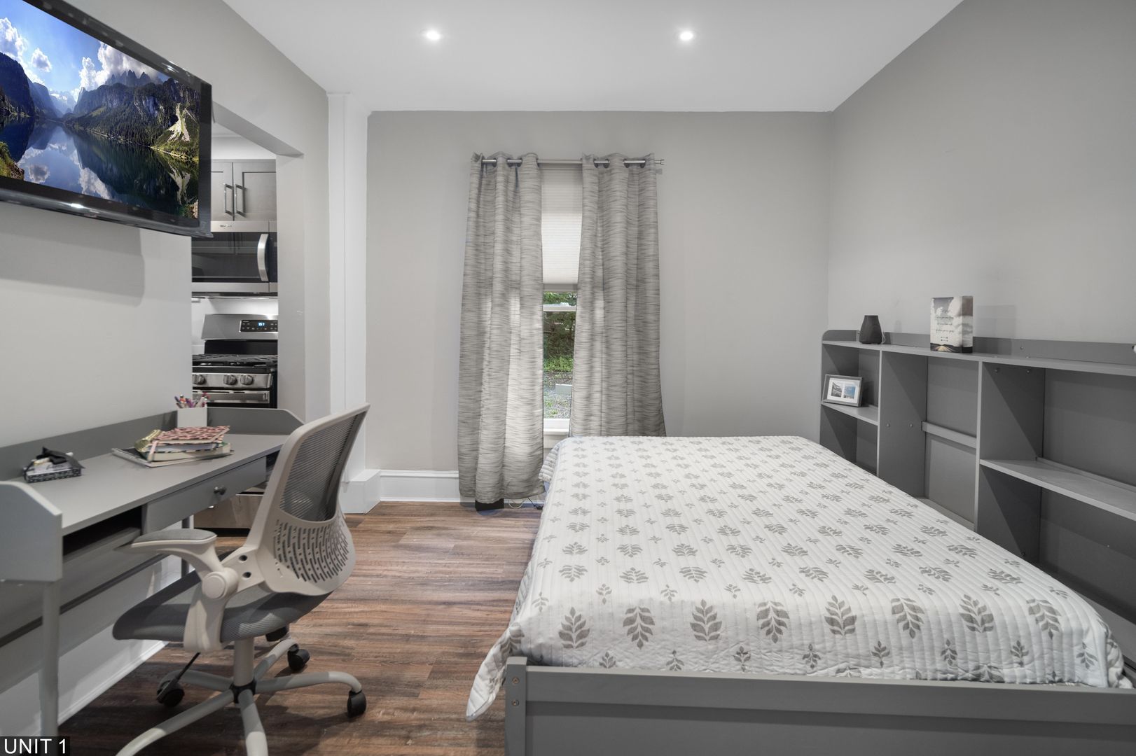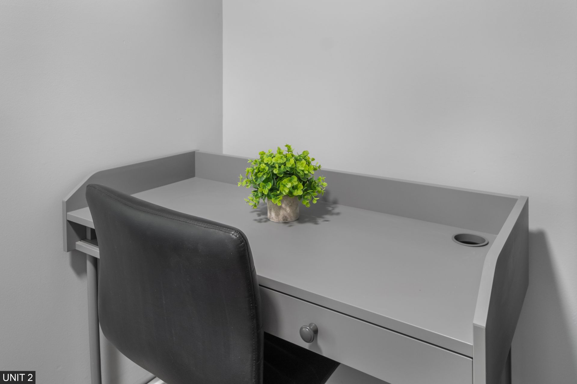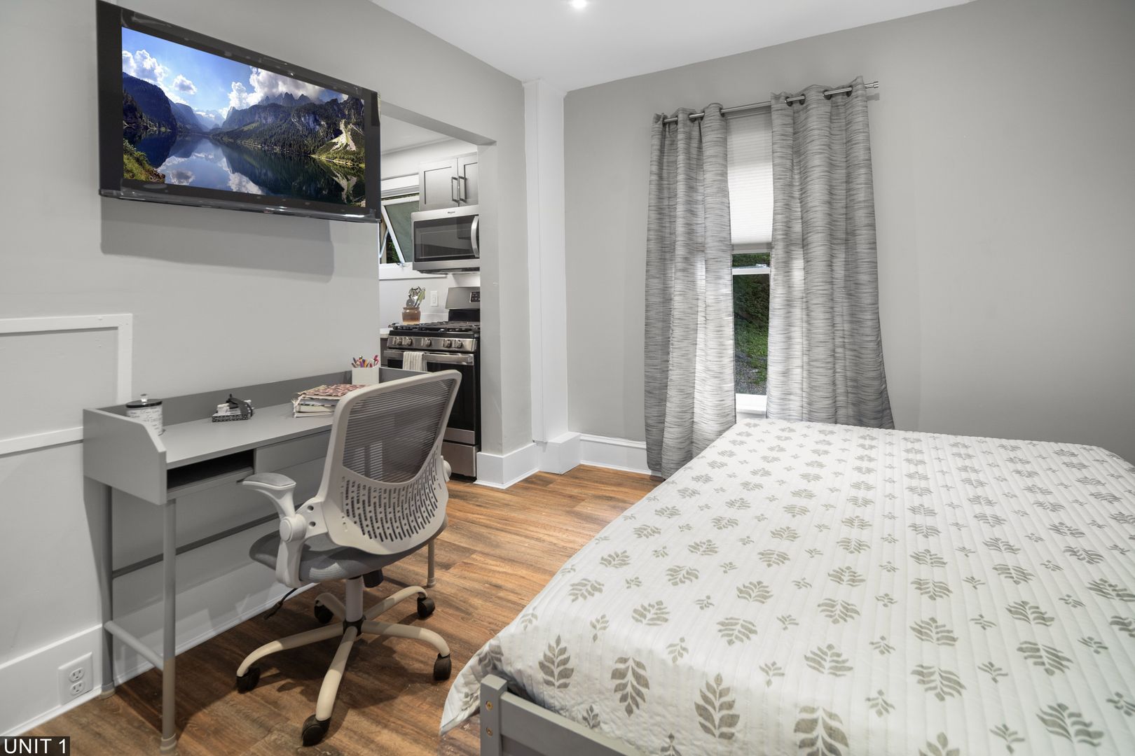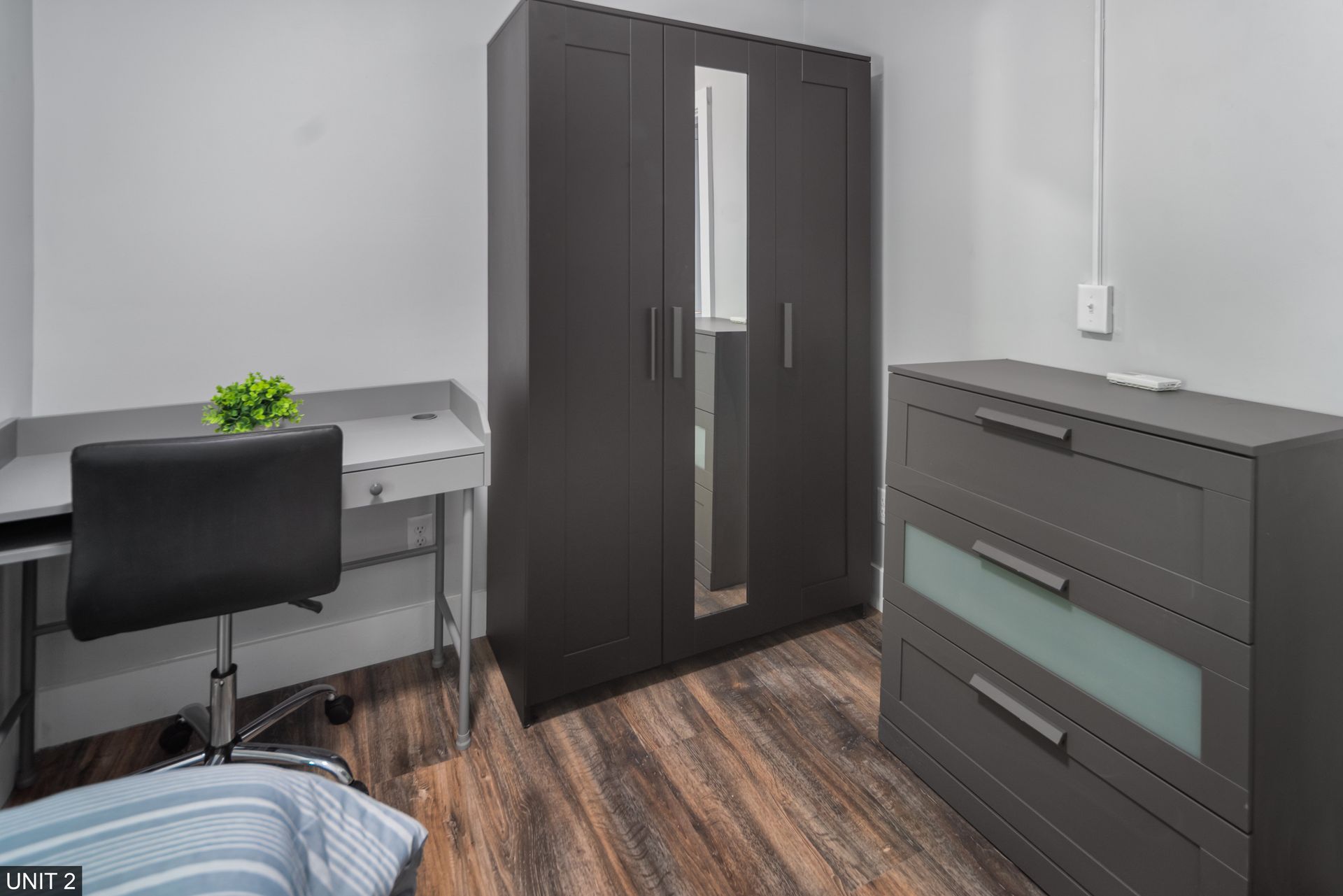 The studio features an open layout with bathroom and kitchenette, perfect for simple meals and study nights. All appliances and furnishings included. New laminate flooring, bluetooth mirror, body sprayers in custom tiled shower, stainless steel appliances, flat screen wall mounted tv.