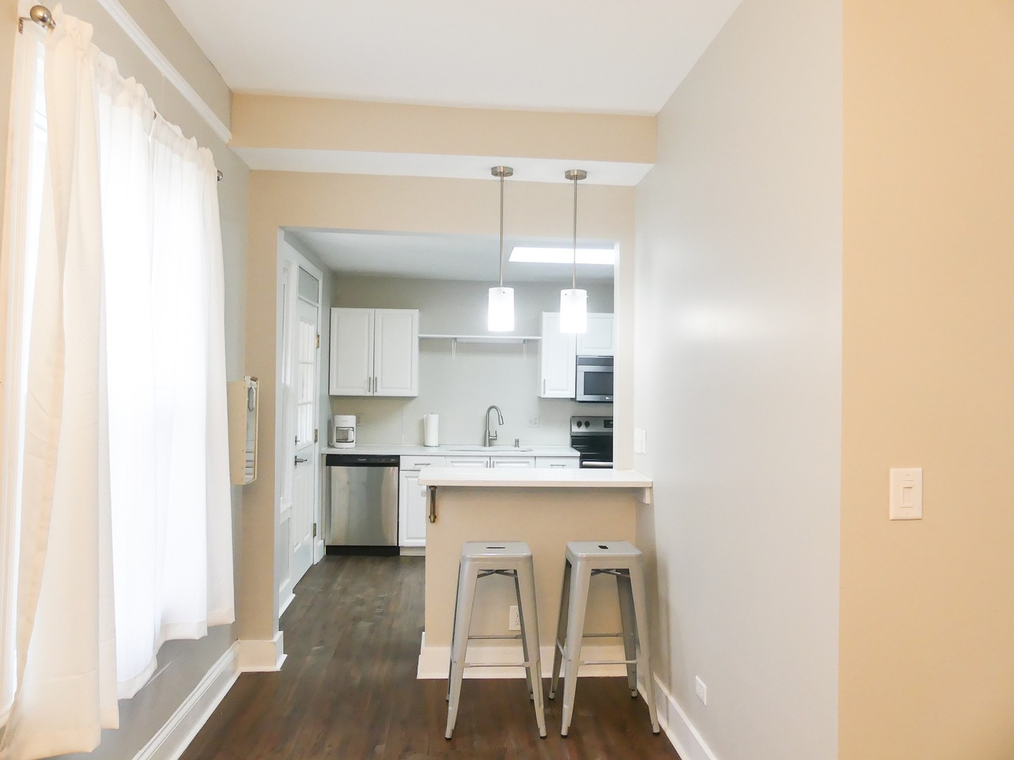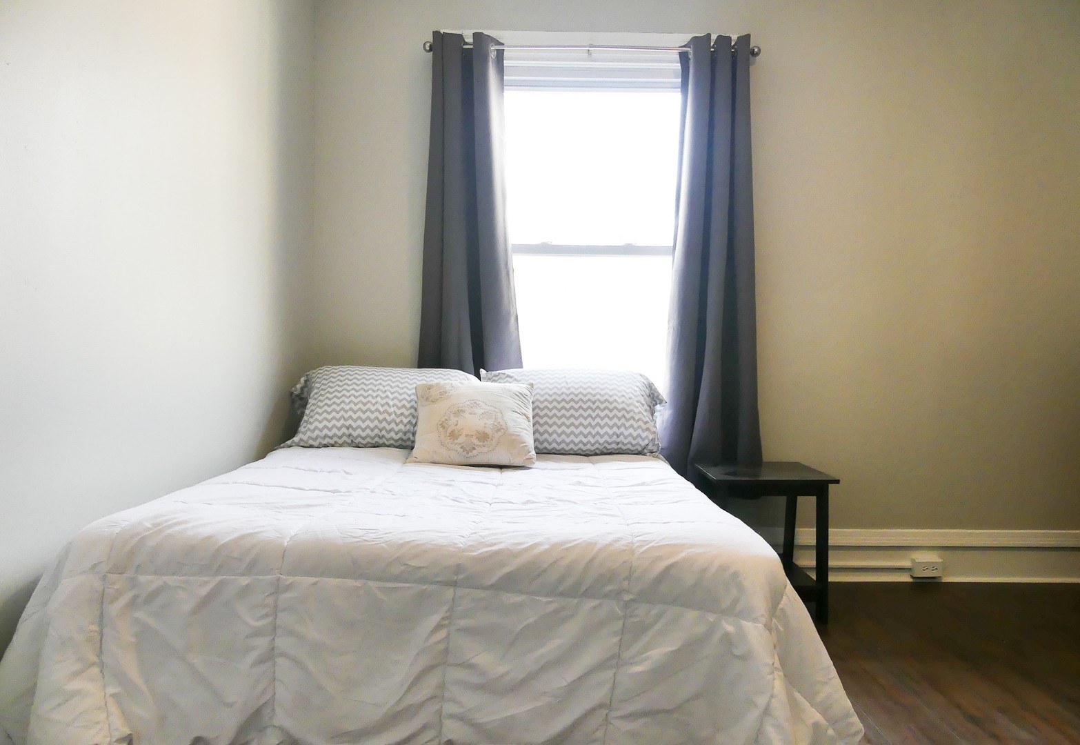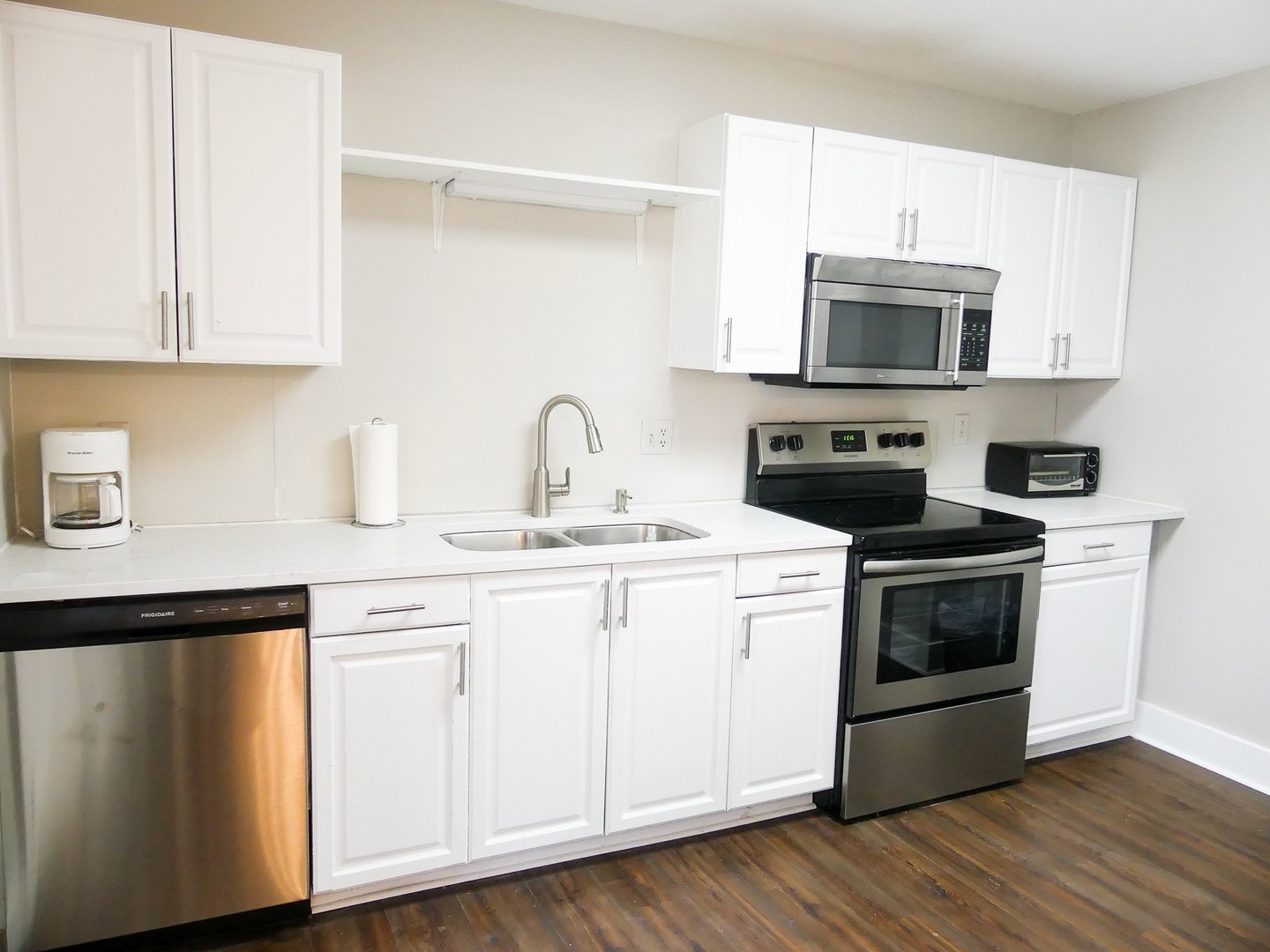 This apartment includes stainless steel appliances, granite counter tops and granite counter top breakfast bar, LED lighting, four large bedrooms and ample closet space. The apartment has its own dining space with a dining table the dining area enters into a large living area space with a mantle and electric fire place. This unit has two full bathrooms with tile flooring. The unit is equipped with its own washer and dryer, and fully furnished with a couch, dining table, beds, dressers, desks and desk chairs. Window treatments also provided at no additional cost.