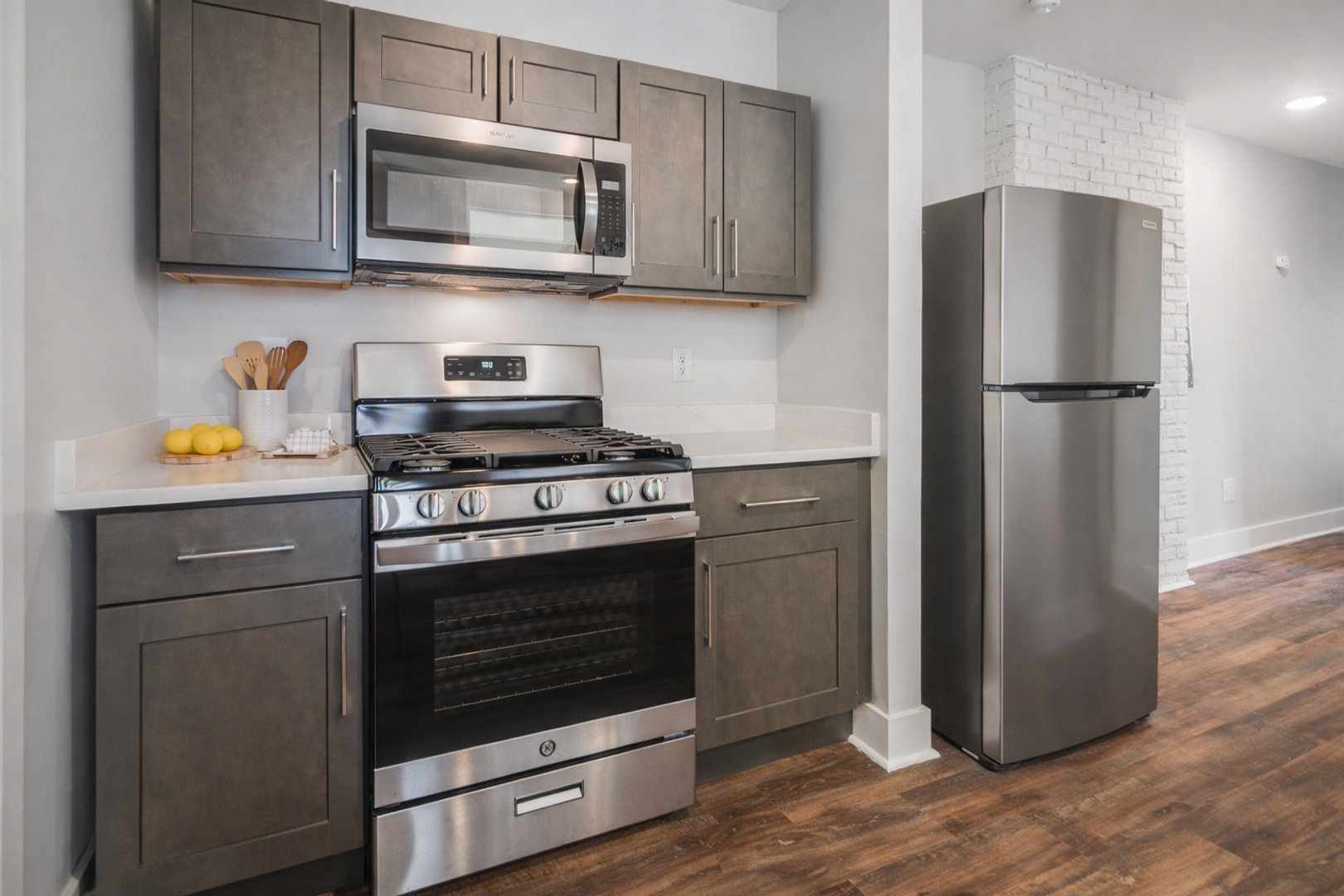 This unit was renovated in the winter of 2021 and features modern finishes such as quartz countertops, stainless steel appliances, new kitchen cabinets, and custom tiling in the bathrooms. There is luxury vinyl tile throughout the apartment and a lot of natural light.