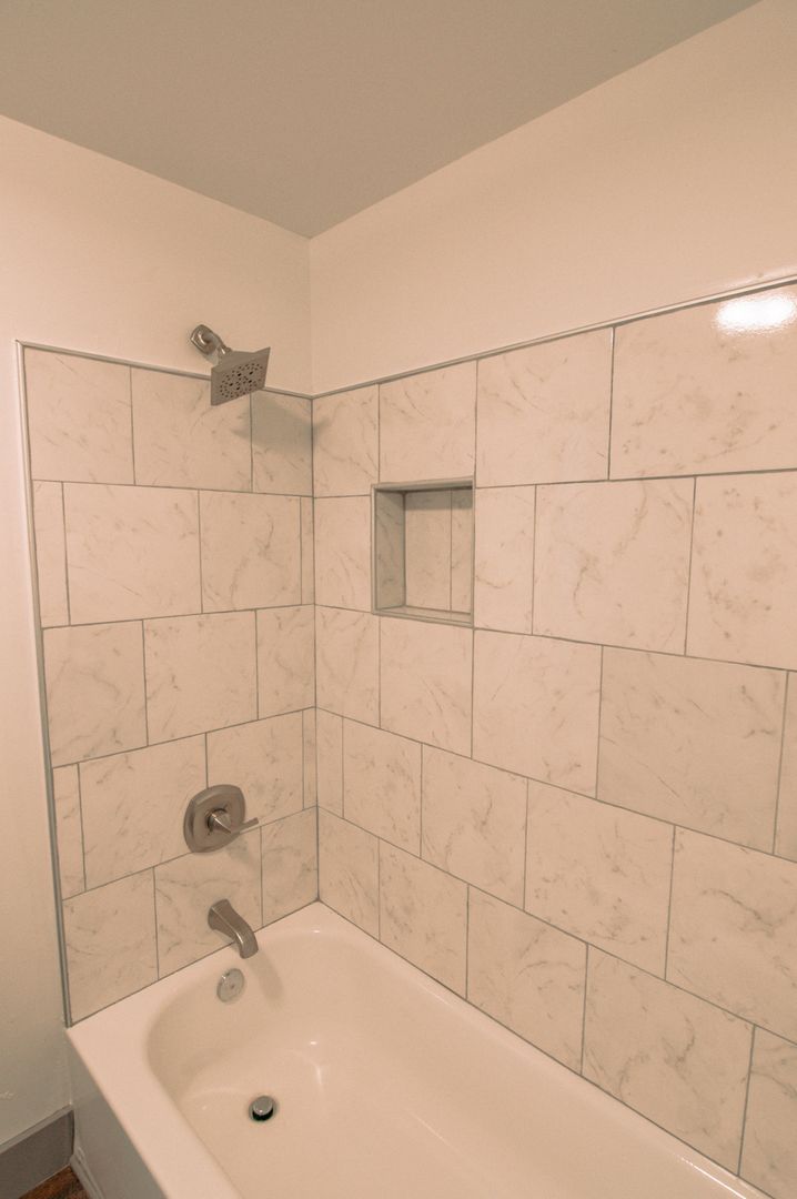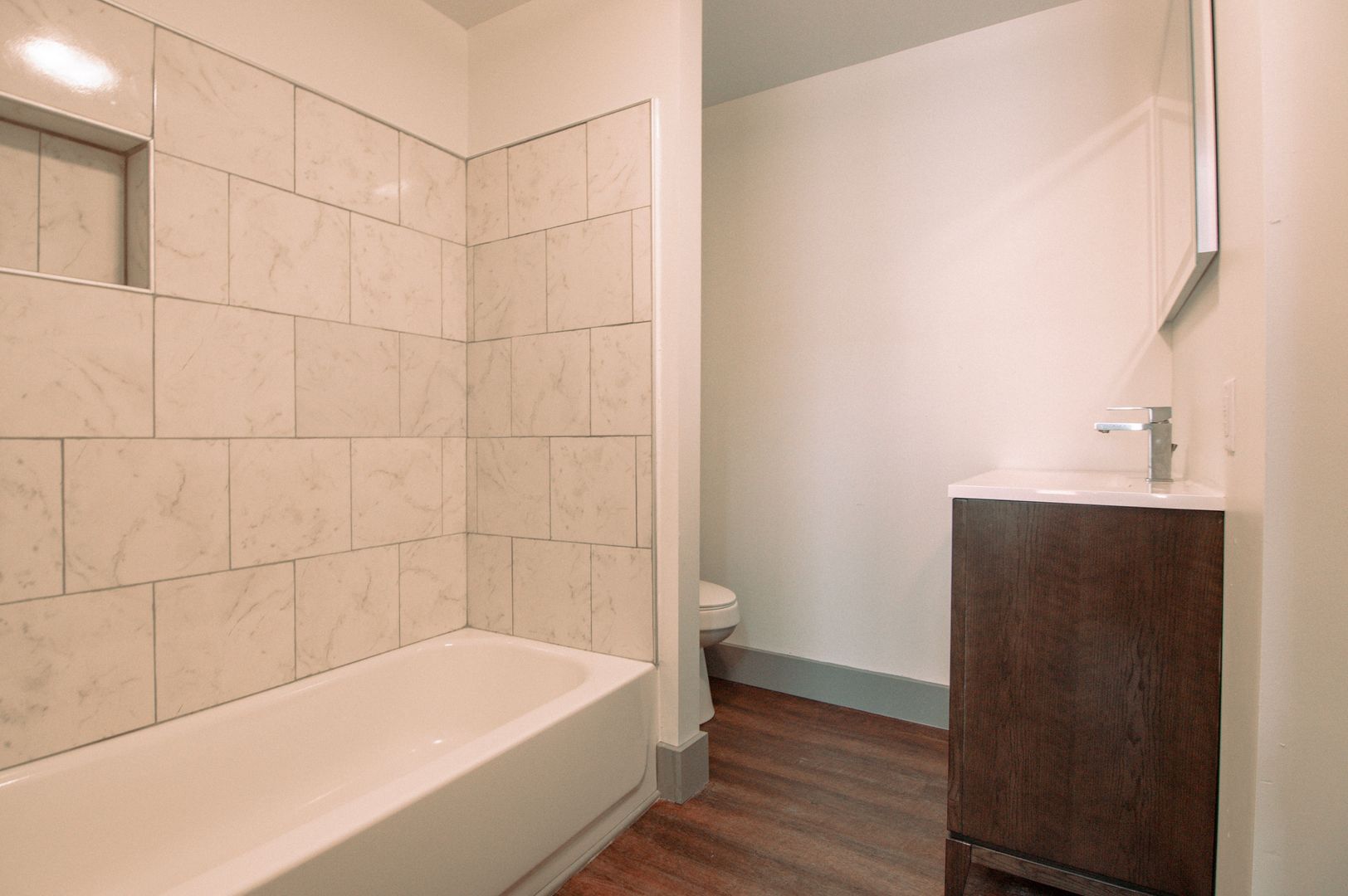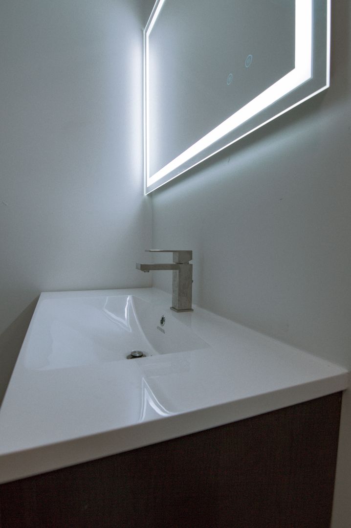 Newly renovated bathroom with a new bathtub and touch-activated LED mirrors